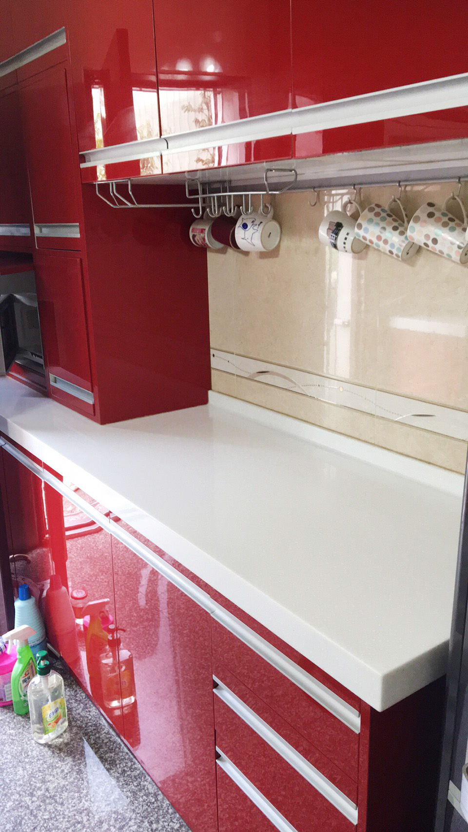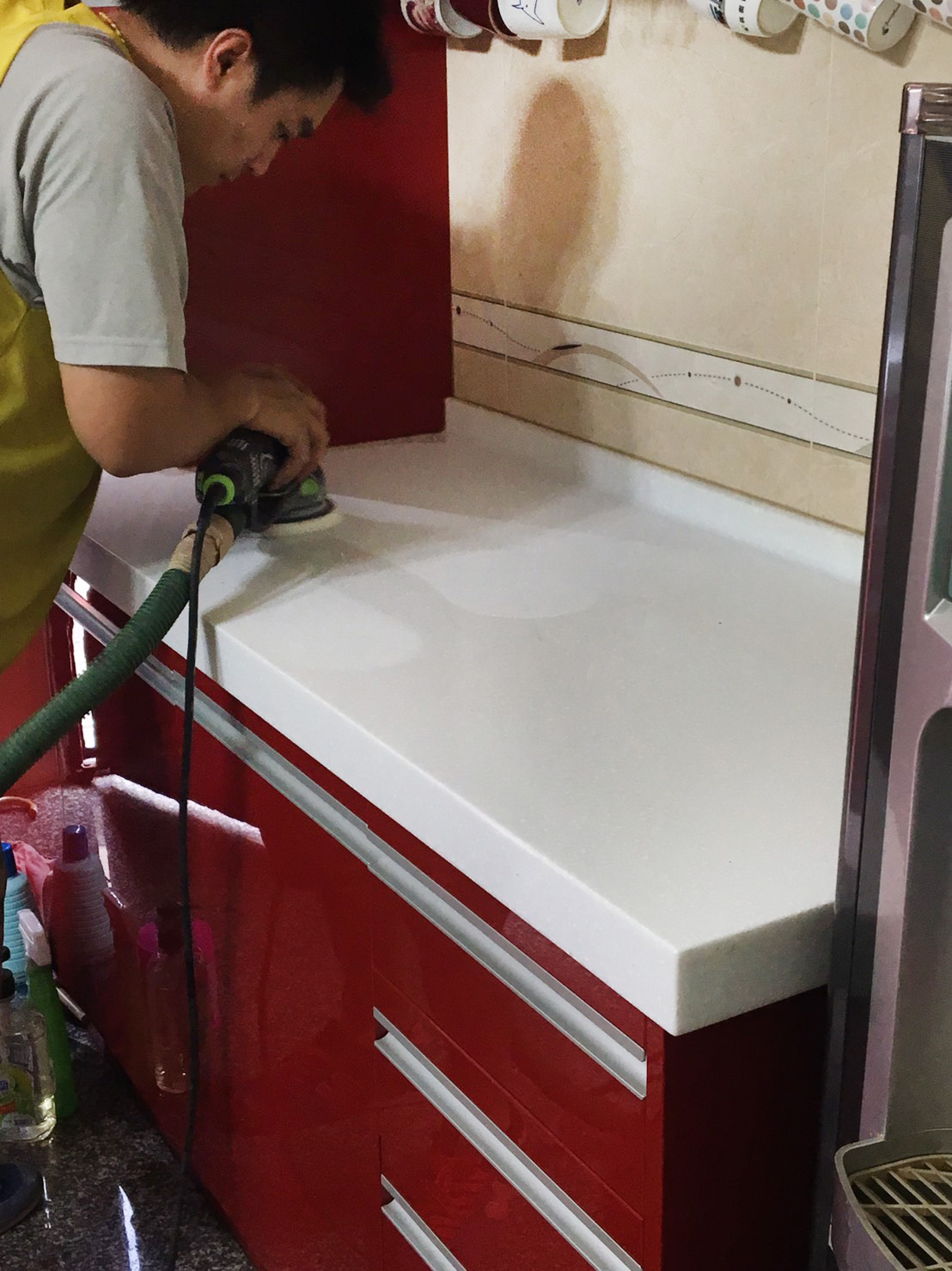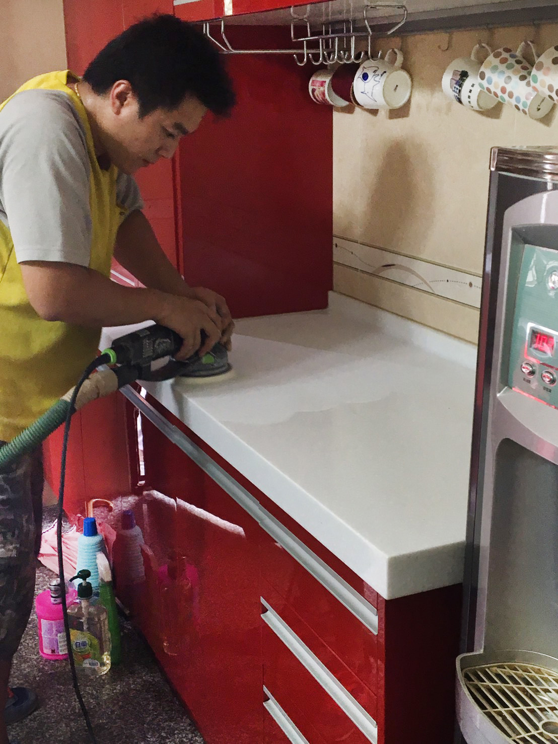 獅子會趙師兄廚具已購買7~8年, 人造石表面變得比較灰灰暗暗的 但是三優精緻歐化廚具人造石都是保固十年 當然義不容辭幫客人做售後服務囉! 今天安排來幫客人拋光上蠟! 仔細看~拋過的地方整的都變白了 整理過之後 整個煥然一新囉