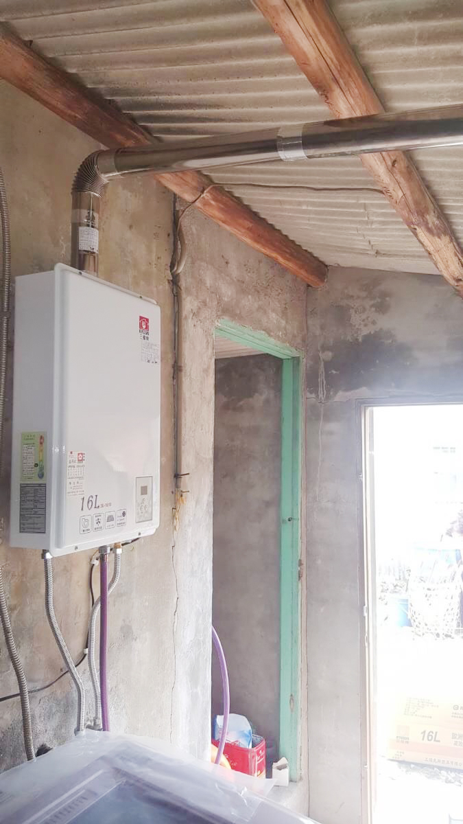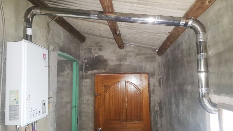 政府一直強調室內空間一定要安裝強制排氣型熱水器 感謝經銷商推薦使用3U1610 16L智慧恆溫熱水器 即使管線長,轉彎處多廢氣一樣能順利排出
