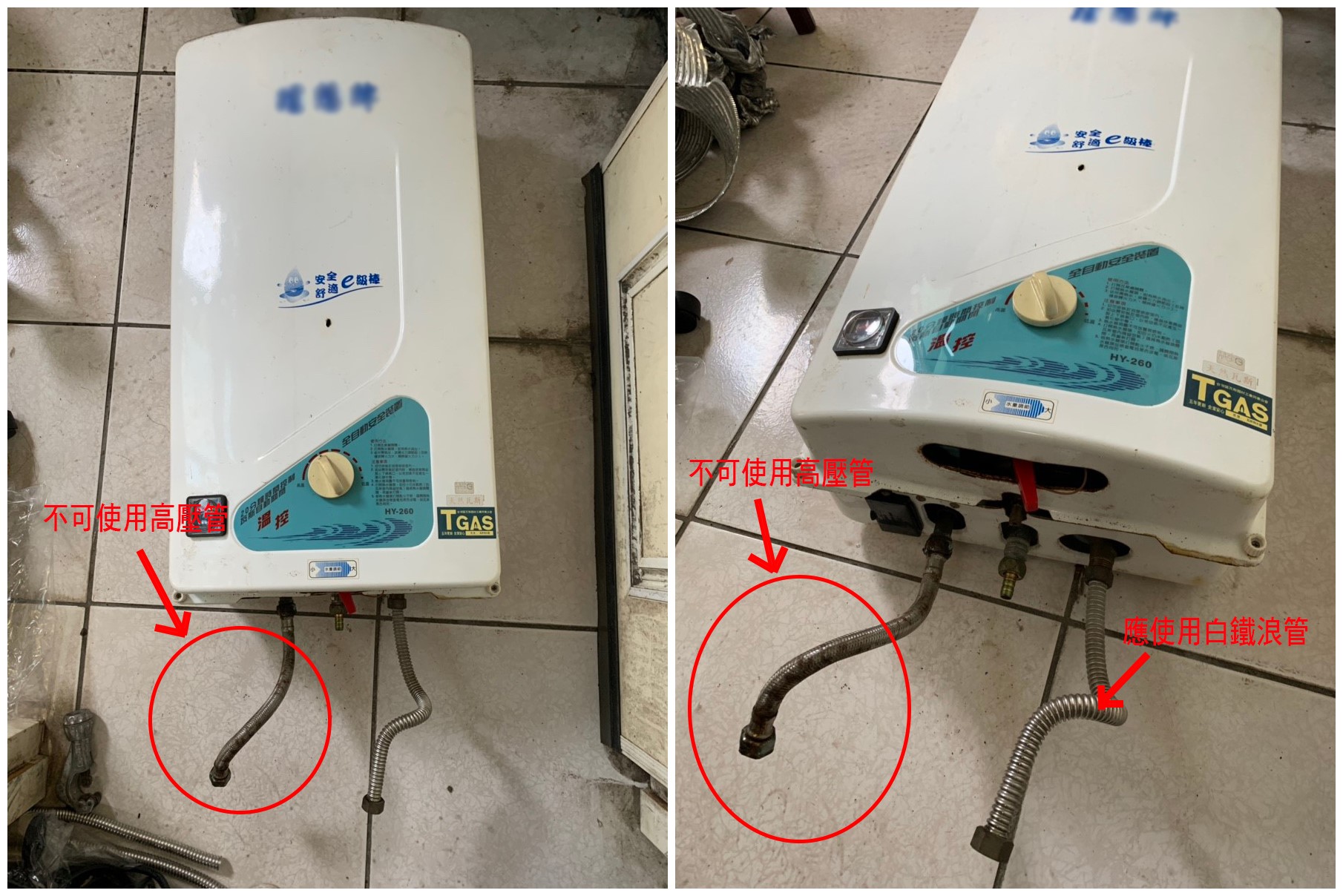 圖2️⃣ 舊熱水器照安裝了❌不合格的高壓軟管